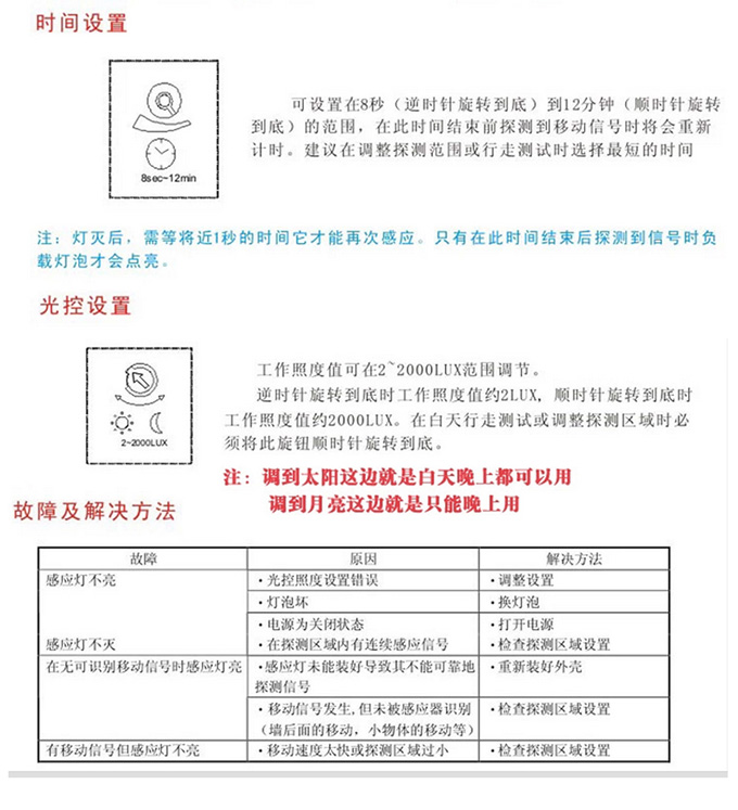1>簡單地說,就是本產(chǎn)品可以設(shè)定為白天燈不亮,晚上有人時燈才點亮;也可按需求設(shè)定為任何時候都點亮。