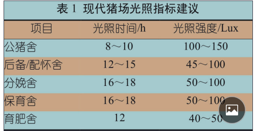 美國農業生物工程學會建議后備 / 配懷母 豬合適的光照強度在 100 Lux 左右,光照時 間為每天 14 h ~ 16 h。