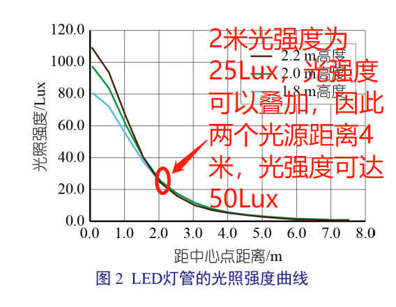 以 LED 燈 管 (18 W、2 100 lm、 6 500 K) 作為單光源對分娩舍內的光源進行 布置。LED 燈管的光照強度曲線如圖 2。分娩 舍所需的光照強度為 50 Lux ~ 100 Lux。從 圖 2 查得在地面距離燈管中心水平距離 2 m 處的光照強度為 25 Lux。根據光照強度的可 疊加性,將兩燈管的水平距離設置為 4 m,則 在兩燈管水平距離中心處地面的光照強度為 50 Lux,滿足分娩舍光照強度需求。